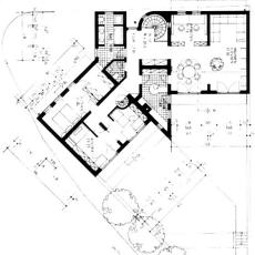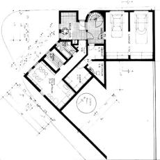 Entsprechend der funktionalen Gliederung ist das Gebäude aus drei Körpern zusammengesetzt, dem flachgedeckten Mittelteil mit den Nebenräumen und den beiden Haupttrakten, deren Pultdächer die Orientierung zur Sonne und zum privaten Freiraum betonen.